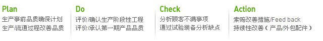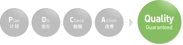 品质保证过程由计划(Plan)、实行(Do)、检验(Check)、改善(Action)等所位P.D.C.A阶段构成,这样的反复 性实行进一步强化竞争力。